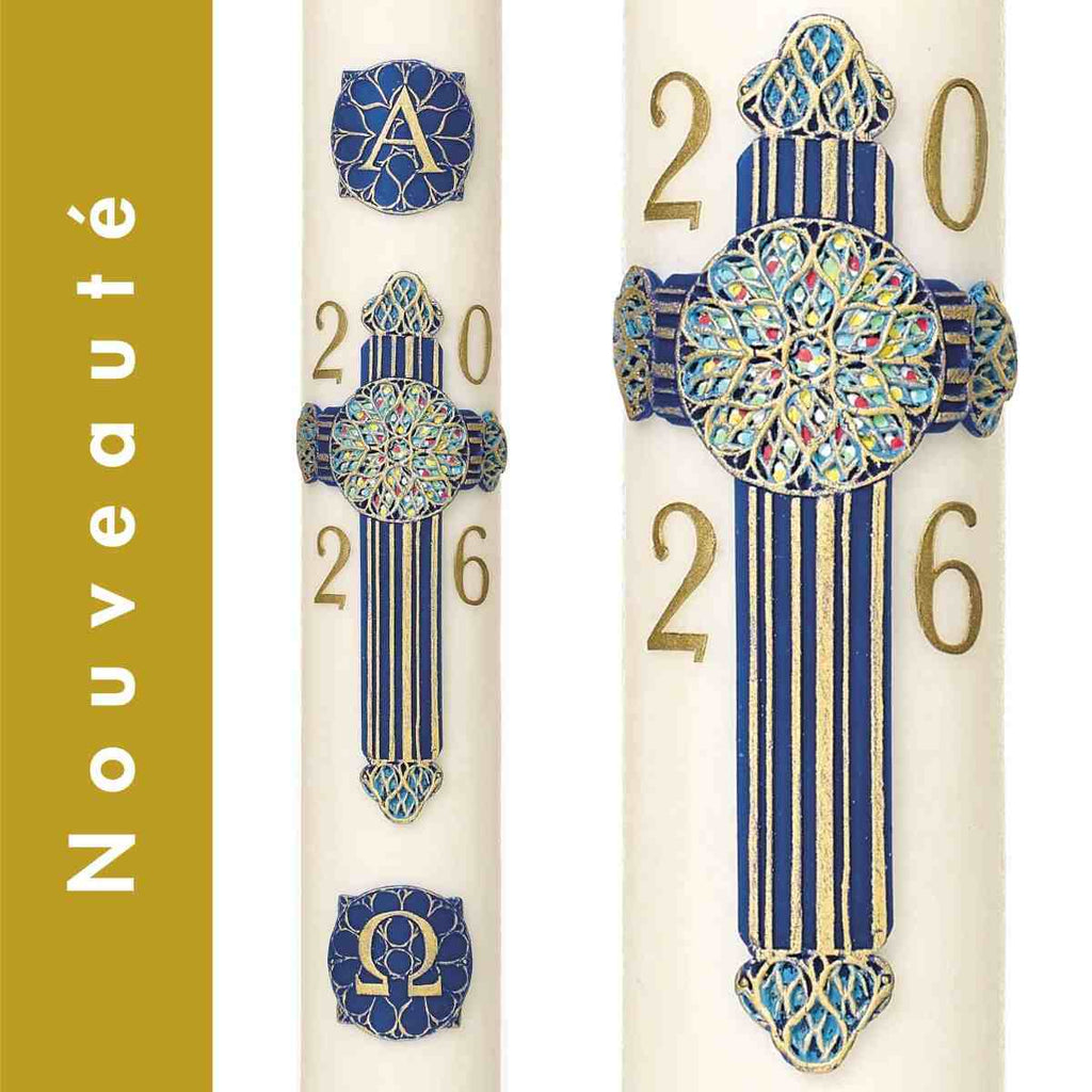 Ce nouveau cierge de Pâques 2026 se distingue par un décor riche et symbolique : une croix bleue et or, rehaussée d’un motif central inspiré des rosaces des cathédrales, où les teintes lumineuses évoquent la lumière de la Résurrection. Les lettres Alpha et Oméga, finement sculptées, rappellent que le Christ est le commencement et la fin de toute chose.