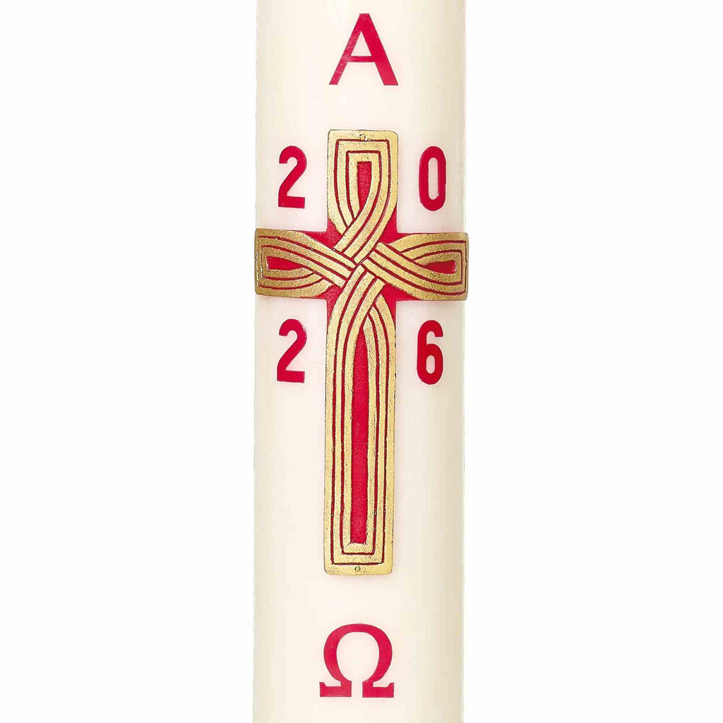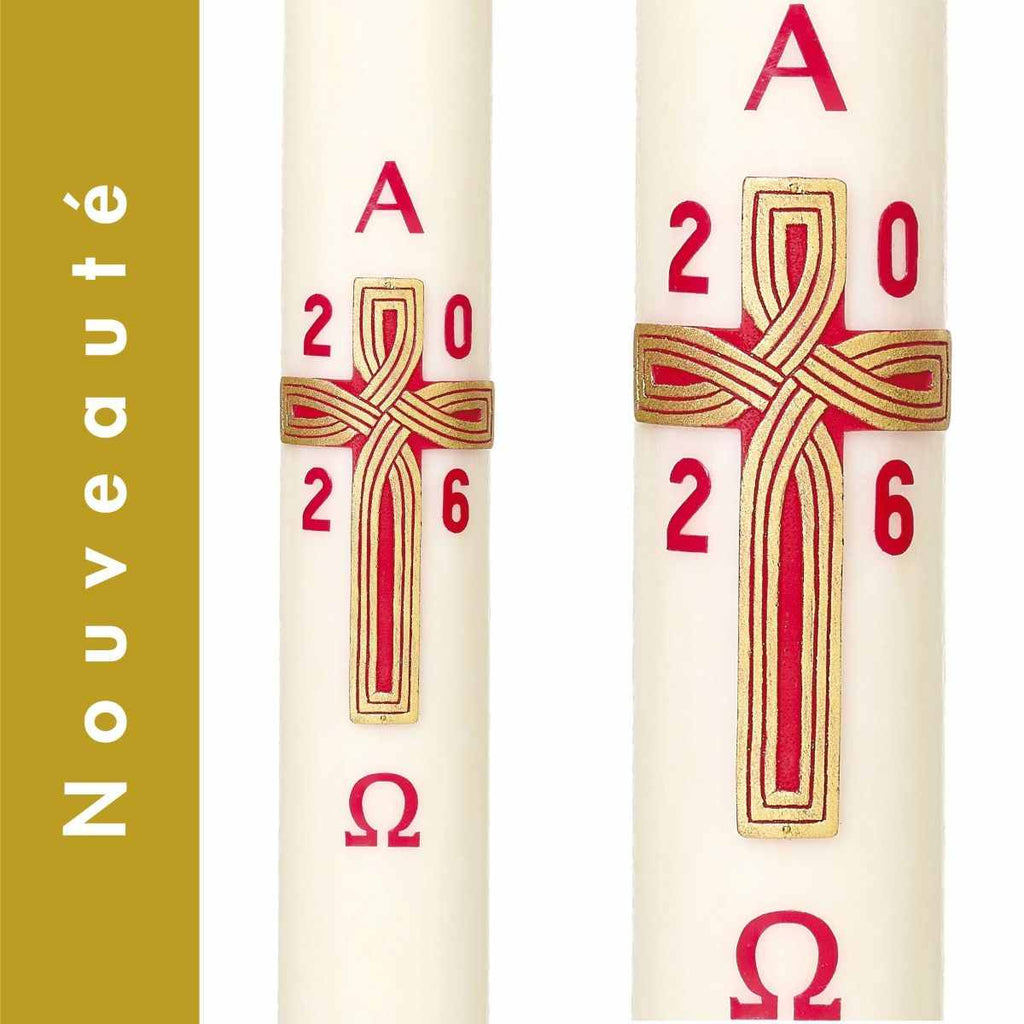 Le rouge de la croix rappelle la Passion, l’or évoque la gloire de la Résurrection. Les lettres Alpha et Oméga et le millésime 2026 proclament le Christ, commencement et achèvement de toute histoire. Cette composition claire et lisible invite à la contemplation et soutient la prière de l’assemblée.