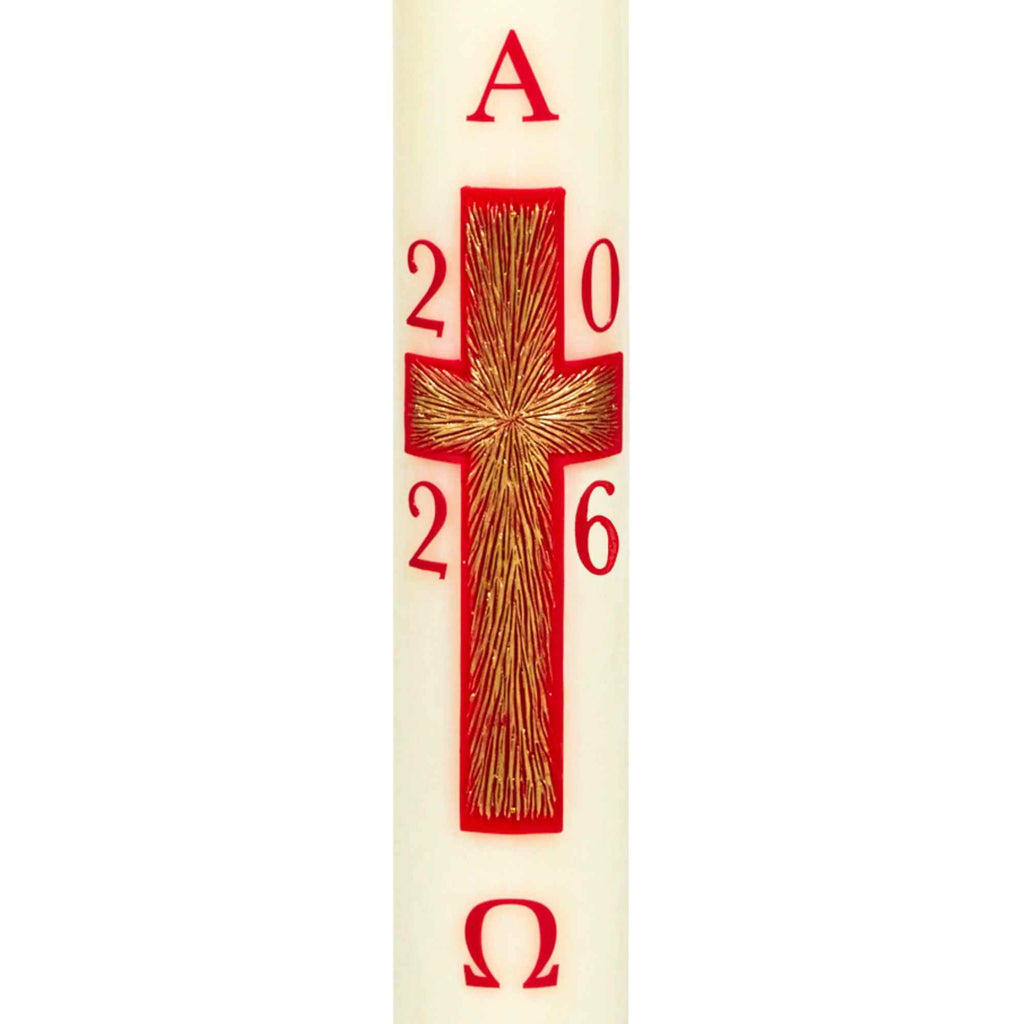 La croix rouge rayonnante évoque le Christ, lumière du monde, dont la Résurrection dissipe les ténèbres de la mort. Le décor doré, patiné et peint à la main, figure les rayons du soleil qui jaillissent de la croix comme signe de vie nouvelle et de gloire divine. Ce cierge pascal proclame la victoire éclatante du Ressuscité, source de lumière et d’espérance pour les fidèles.