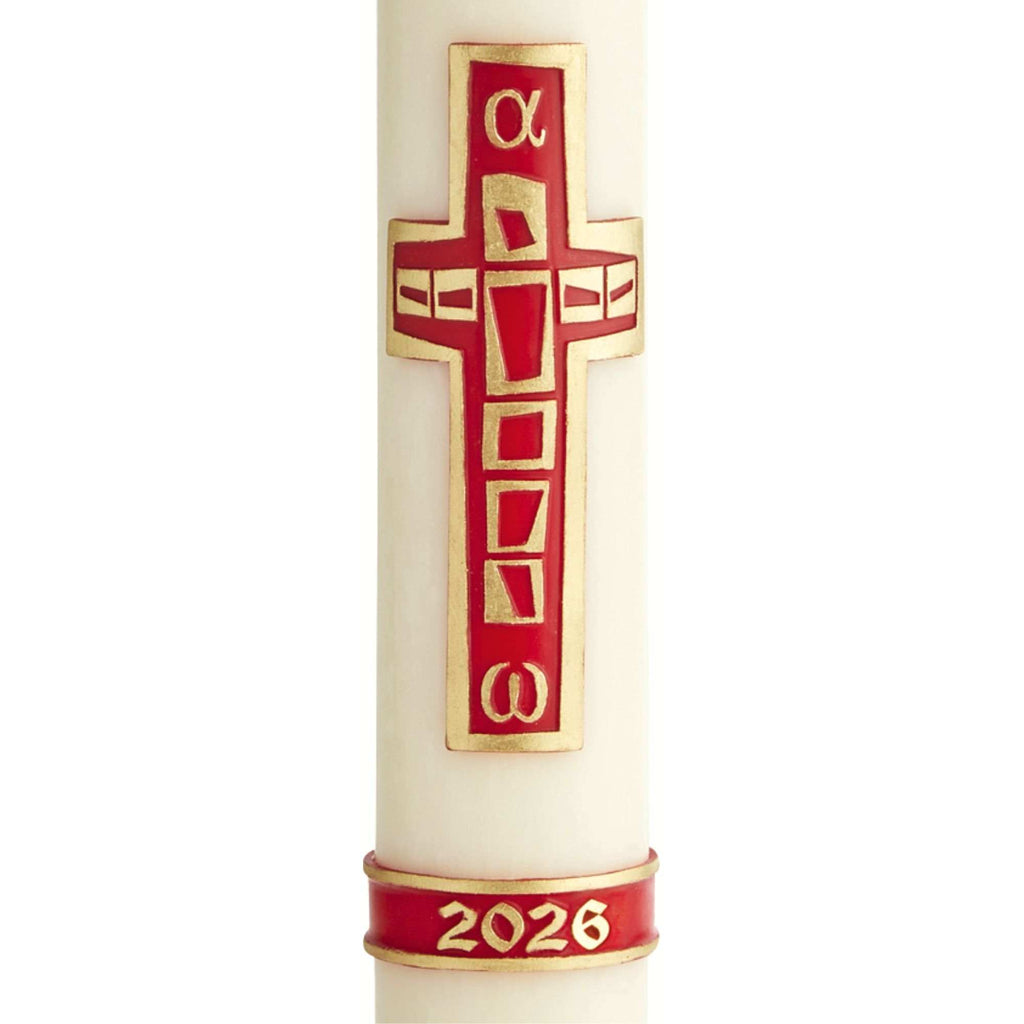 La croix rouge et or de ce cierge de Pâques rappelle l’art sacré des vitraux, où la lumière se fait prière et beauté. Ce décor évoque la clarté du Christ ressuscité qui illumine son Église. Comme un vitrail qui laisse passer la lumière, ce cierge devient signe de la présence vivante de Dieu au milieu des fidèles.