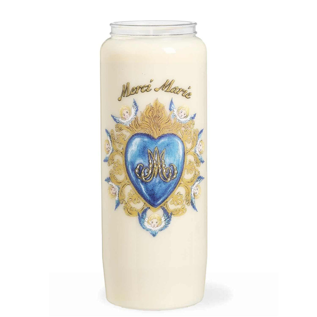 La bougie de neuvaine “Merci Marie” est une bougie de prière mariale spécialement dédiée à l’action de grâce. Son illustration met en lumière un cœur bleu orné du monogramme marial, entouré d’un rayonnement doré et de figures angéliques.